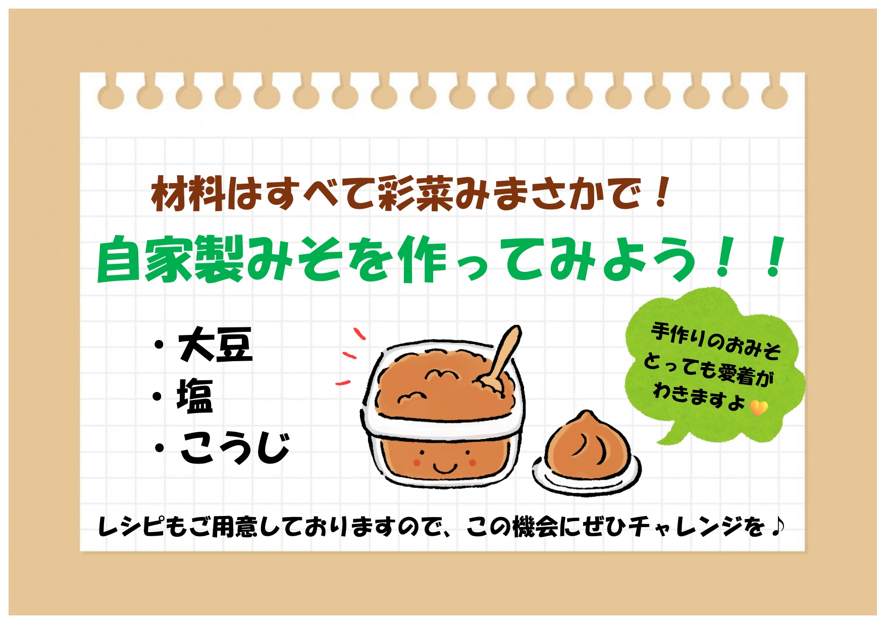 今年はお味噌づくりにチャレンジしてみませんか?材料はすべて当店でそろいます!帰ってすぐに始めていただけるよう、レシピもご用意しております。自家製のお味噌、出来上がりが待ち遠しいですね♪