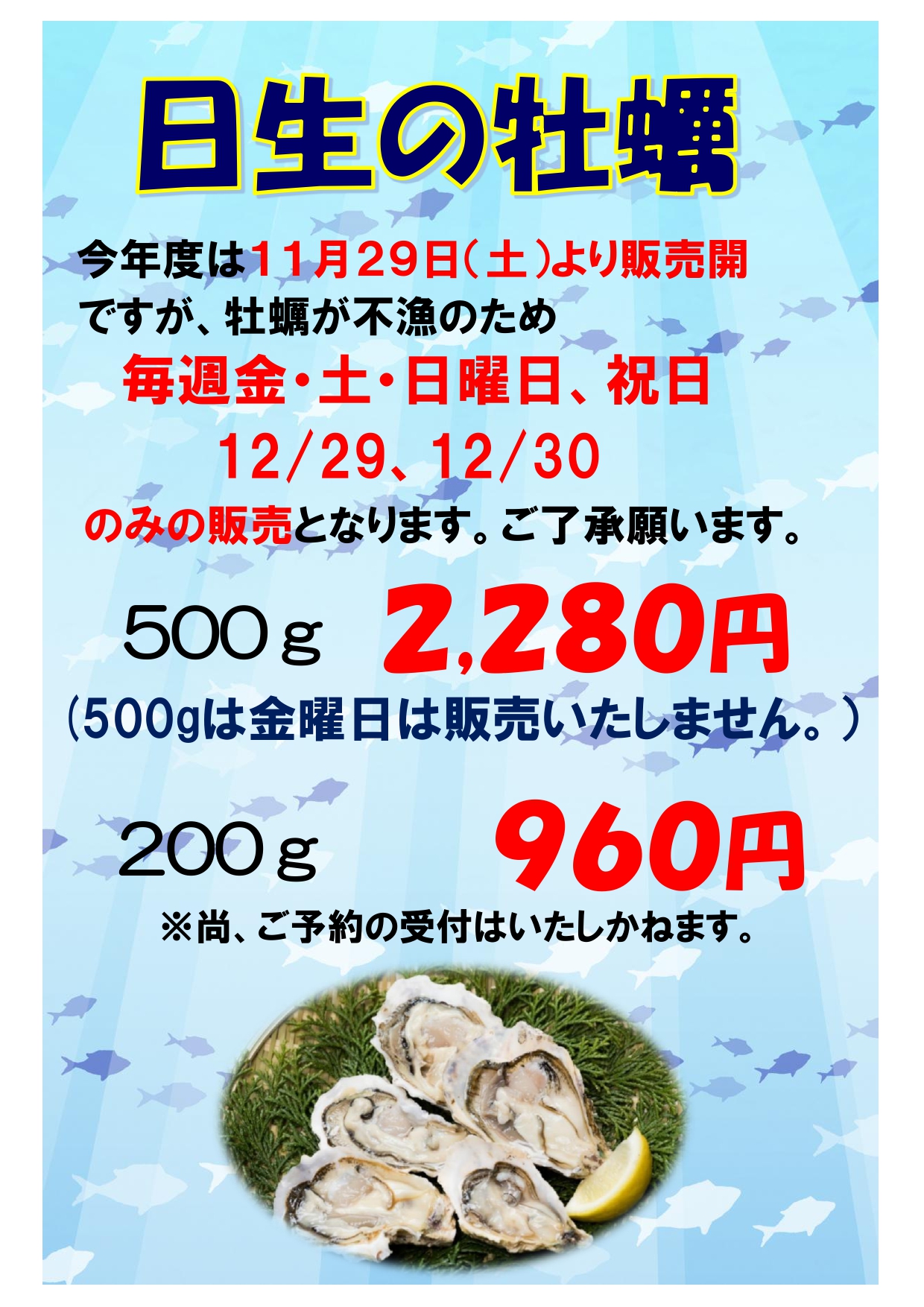 今年度は不漁の為、販売日を毎週金・土・日曜日と祝日、12月29・30日とさせていただきます。